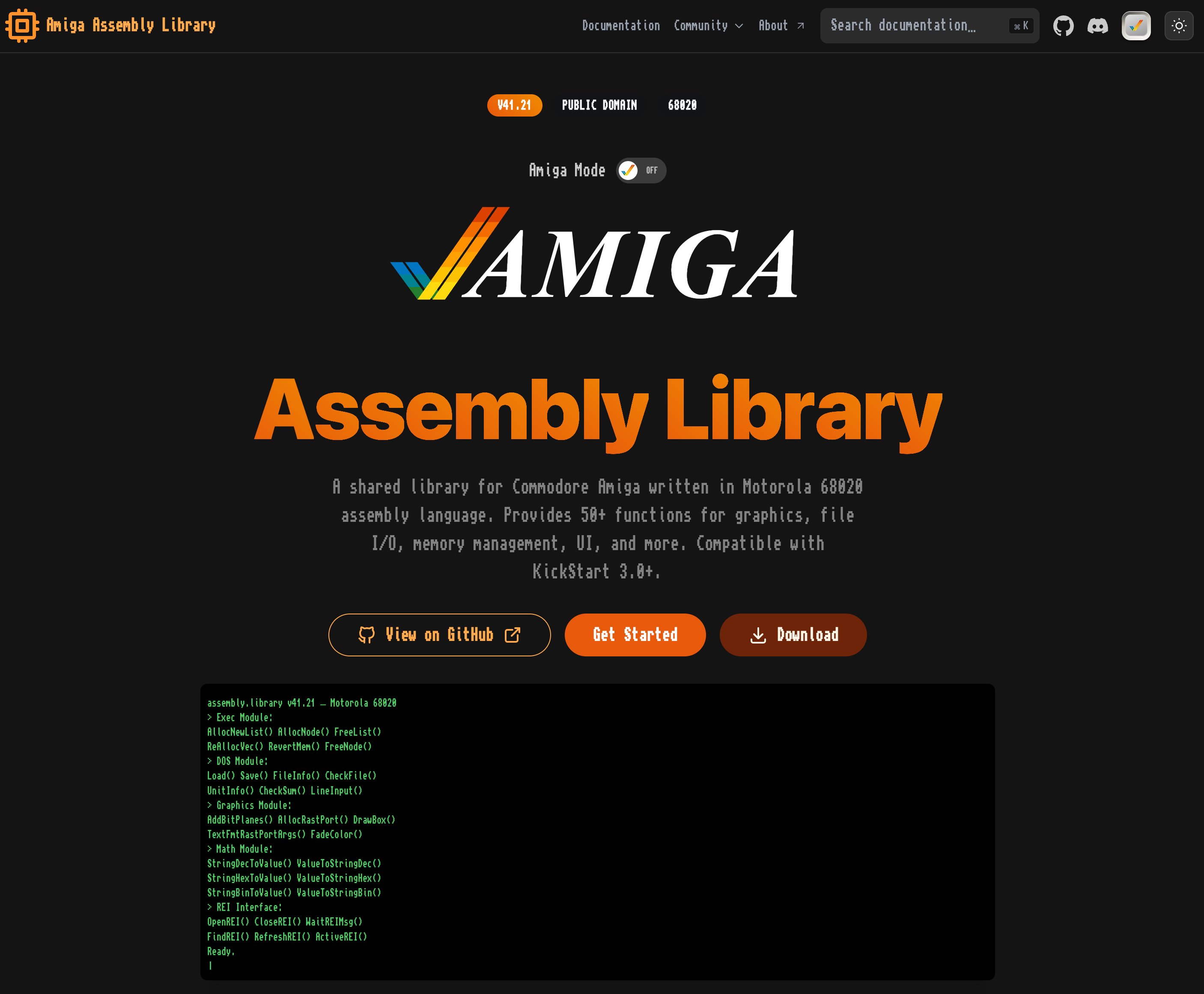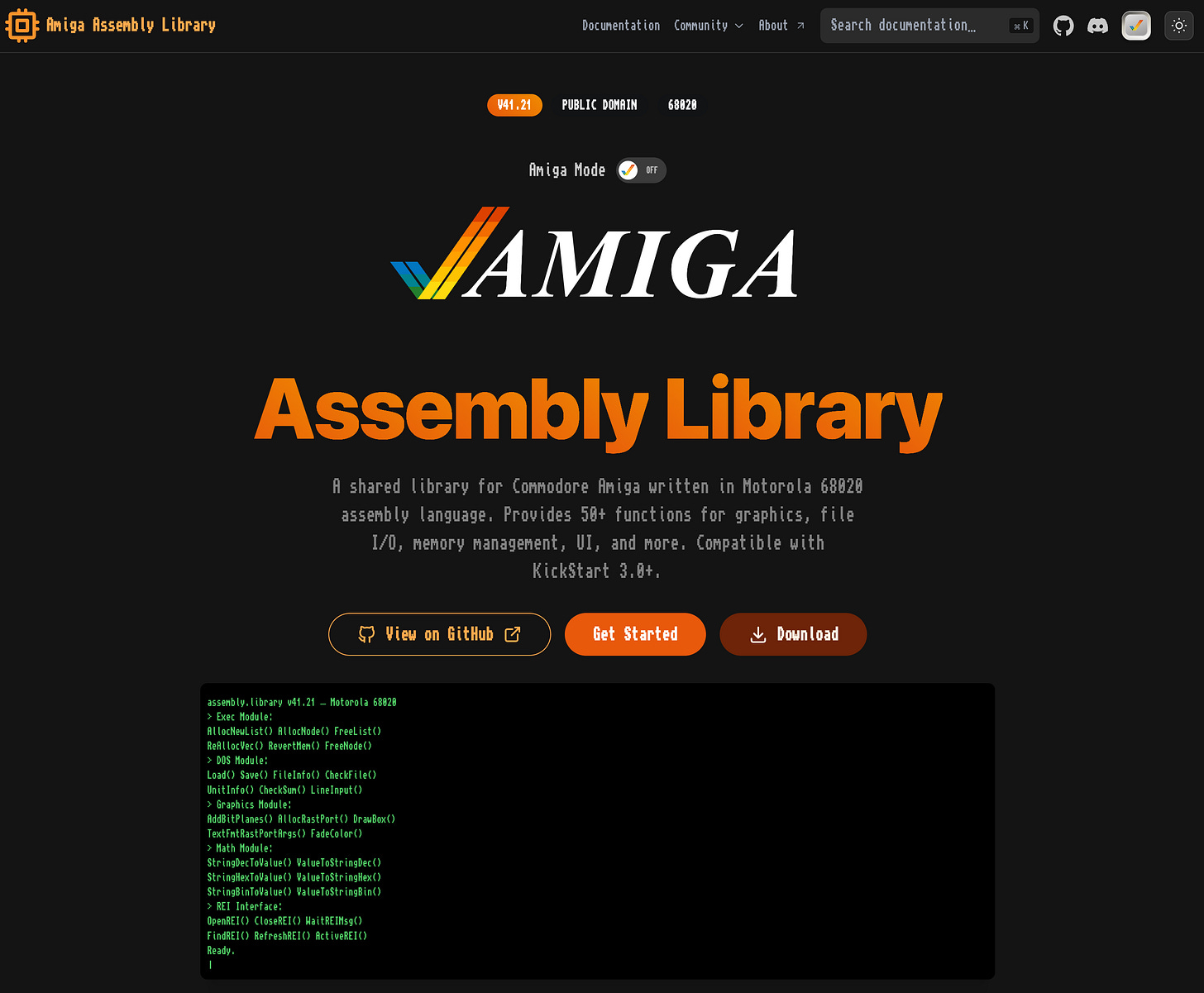 Here’s where old meets new. The library documentation lives at amiga-assembly-library.vercel.app — a modern site built with: