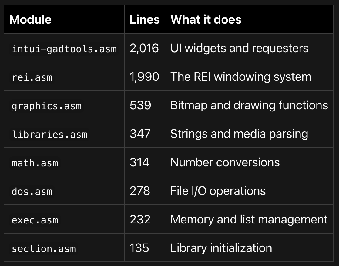 Back in 1991, I started writing what would become a 5,800-line shared library for the Commodore Amiga — entirely in hand-optimized Motorola 68020 assembly. The first routines (string utilities in libraries.asm) were saved on July 29, 1991. Over the next four years, the library grew steadily — graphics in October 1994, file I/O and memory management in early 1995, the REI windowing system through mid-1995, and the last recorded update in September 1995.