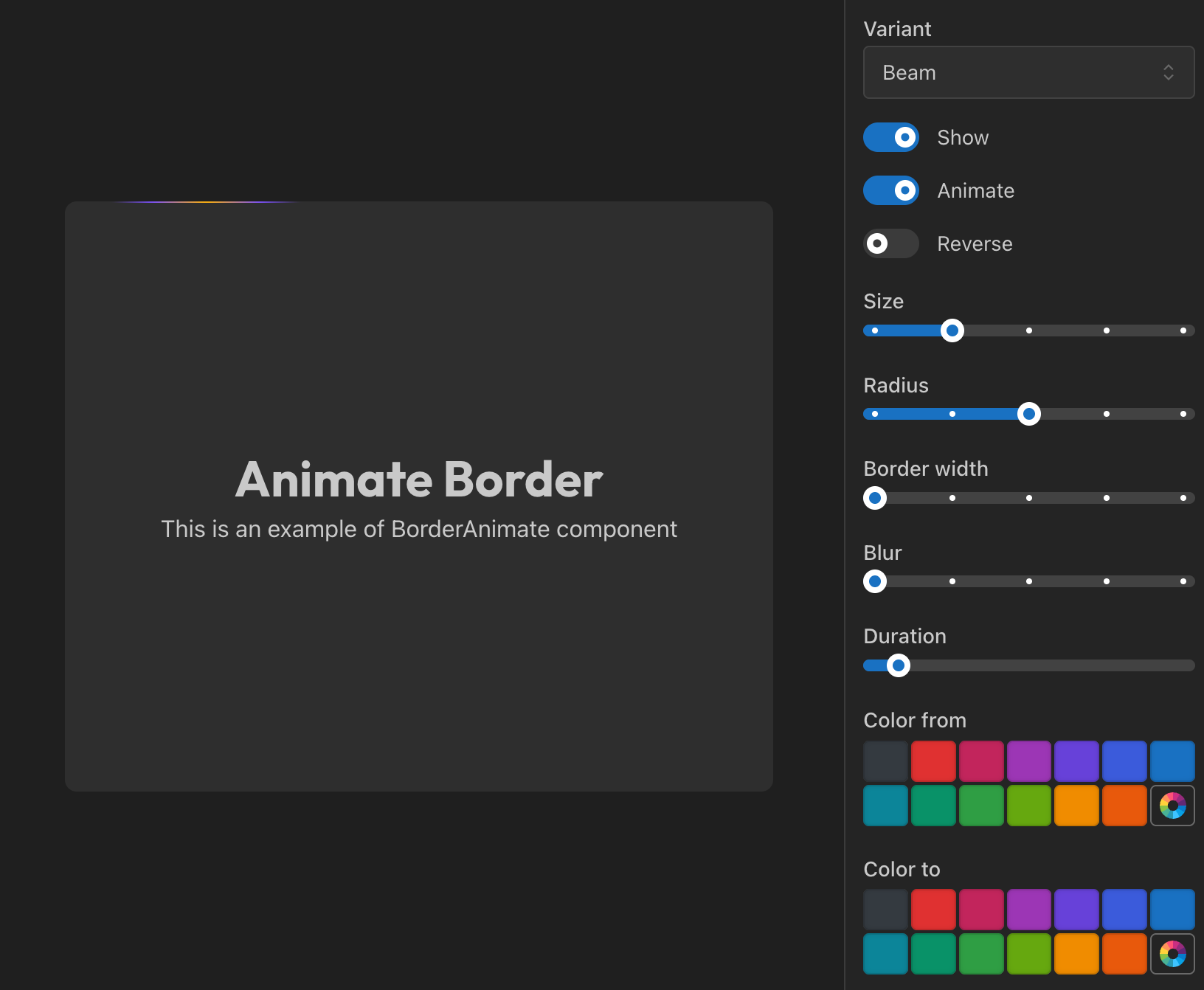 Switch via the variant prop and fine‑tune with props like colorFrom, colorTo, size, blur, duration, border width, radius, and more.
