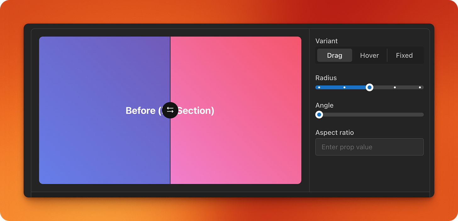 angle={0}: classic vertical divider (left/right).angle={90}: horizontal divider (top/bottom).angle={30}(or any 0–360): diagonal for more dynamic reveals.