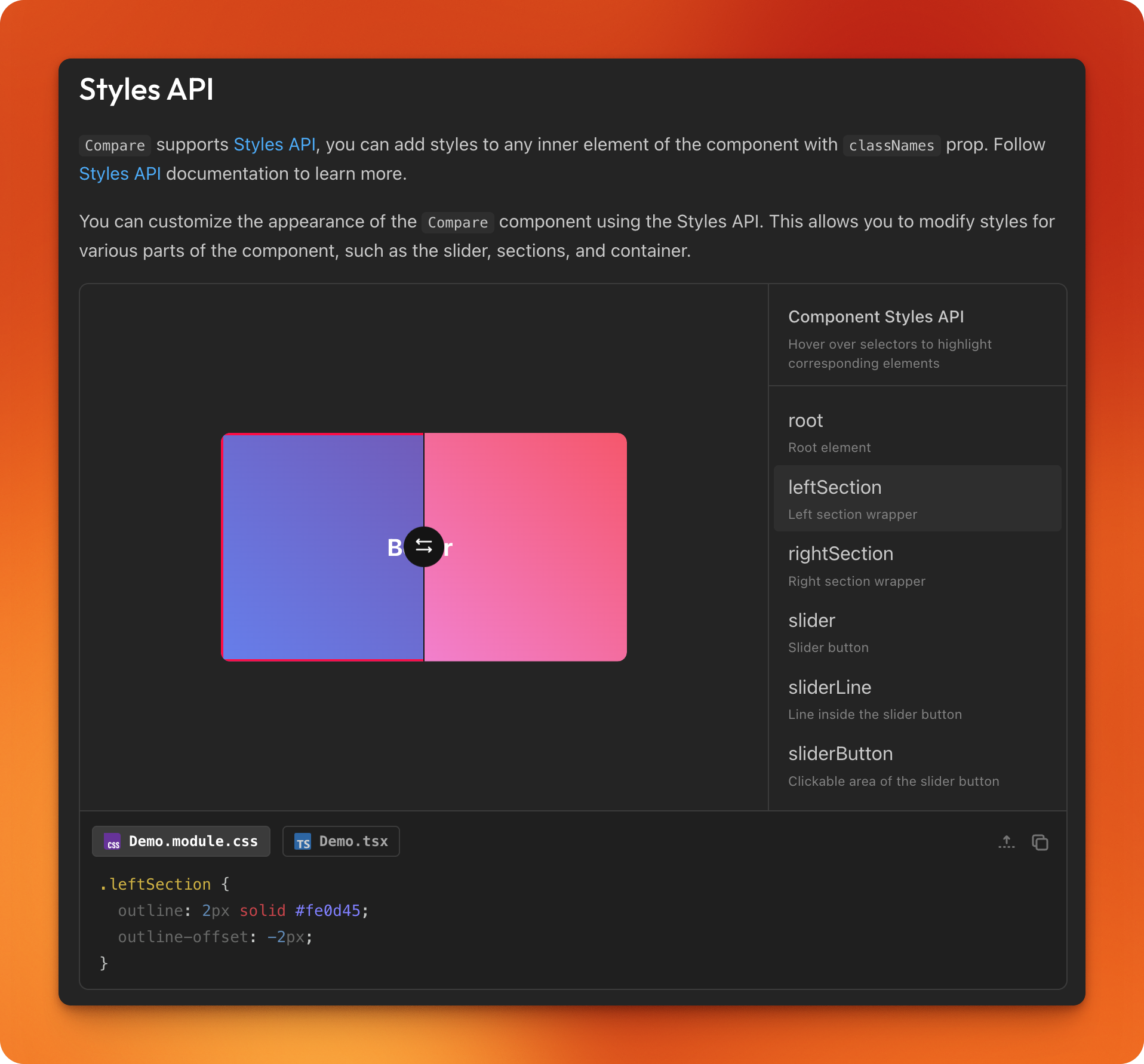 Mantine Compare embraces Mantine’s Styles API, exposing classNames hooks like root, leftSection, rightSection, slider, sliderLine, and sliderButton. This gives you granular control to sync with your theme, support dark mode, and integrate brand motion or colors—without hacking CSS.