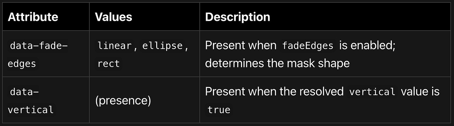 Why CSS masks? The previous overlay-div approach had a fundamental limitation: the fade color had to match the background. If your page background was a gradient, an image, or simply a different color than what you passed to fadeEdgesColor, the fade edges would look wrong. CSS mask-image performs true alpha compositing at the GPU level -- it masks pixels directly, independent of what is behind them.