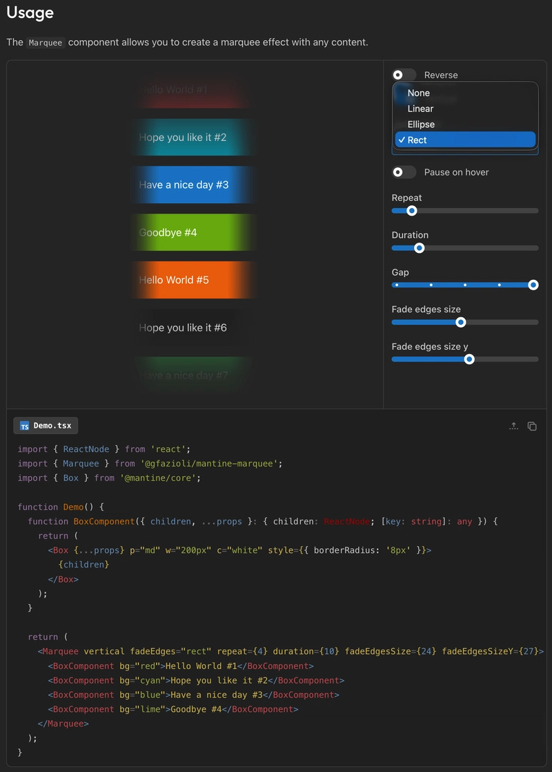 <Marquee fadeEdges="rect">{children}</Marquee> // all 4 edges independentlyThe type signature is: