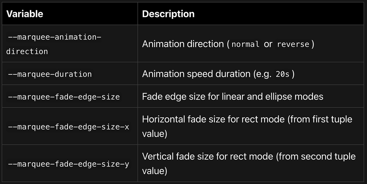 | [x, y]; // tuple: [horizontal, vertical]A single value applies uniformly to all edges. A tuple lets you set different sizes for horizontal (x = left/right) and vertical (y = top/bottom) fading. The tuple maps to two new CSS custom properties: --marquee-fade-edge-size-x and --marquee-fade-edge-size-y.