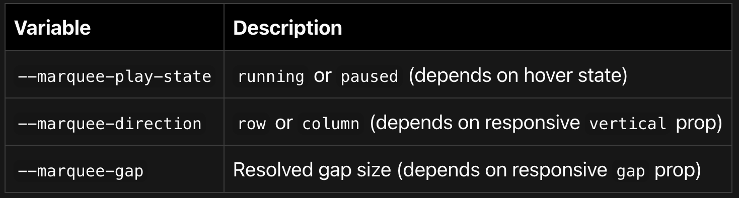 --marquee-gapor--marquee-directionvia thevarsprop, switch to using thegapandverticalprops directly.If you have custom CSS targeting