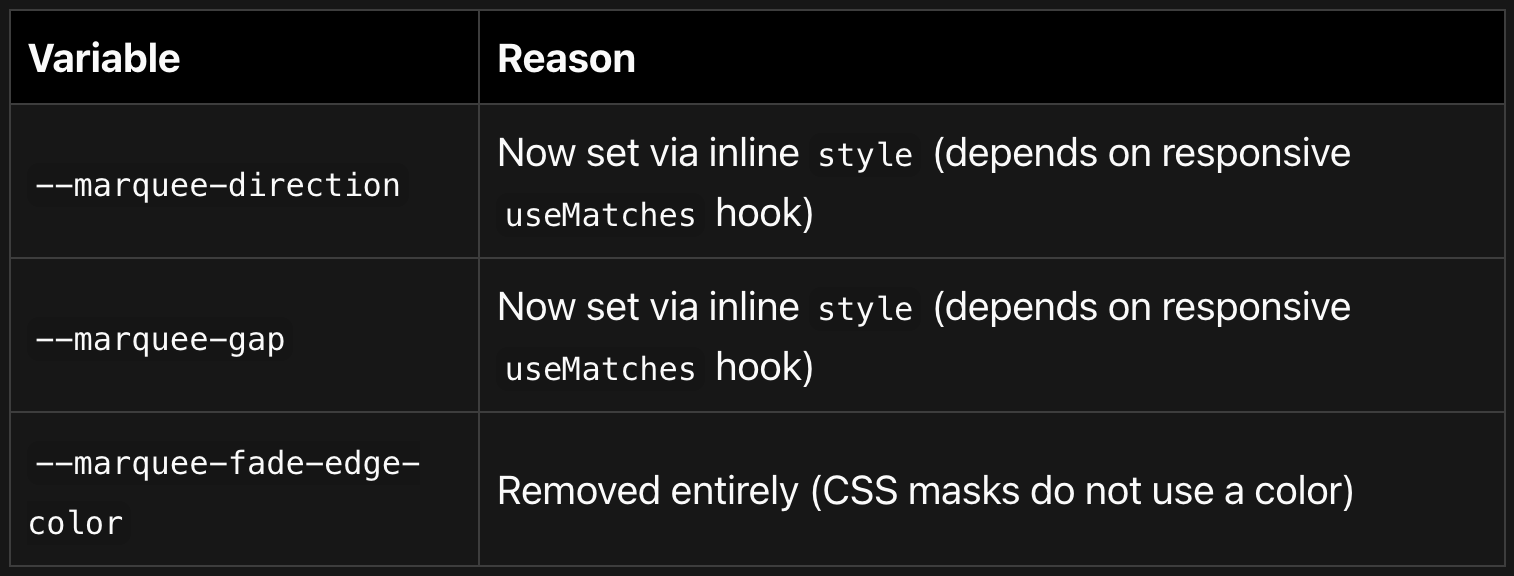 The following CSS variables have been removed from MarqueeCssVariables and are no longer available via the vars prop:
