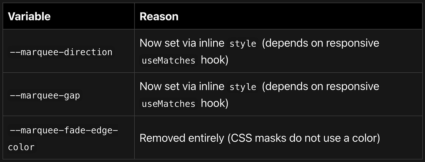 overflow: hiddenwas previously set on both.rootand.marqueeContainer. The double declaration created an extra stacking context that could interfere with GPU layer compositing. It is now only on.root.Zero additional DOM nodes for fade edges -- The old system rendered 2-4 absolutely-positioned