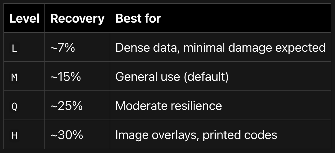 errorCorrectionLevel?: 'L' | 'M' | 'Q' | 'H'; // Default: 'M'