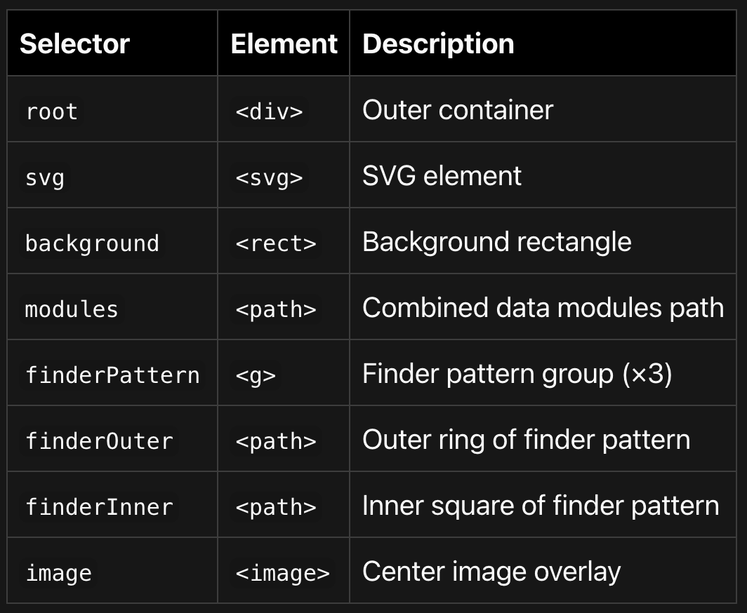 Each style generates a single combined <path> element for all data modules, keeping the DOM lightweight even for dense QR codes.