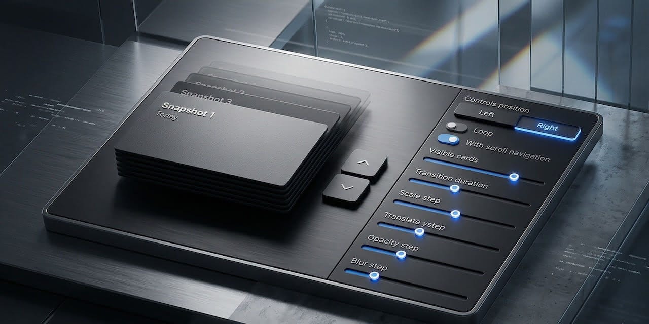 A Mantine component that turns flat item selection into a spatial, 3D card-stack browsing experience — with keyboard, wheel, touch, and click navigation built in.