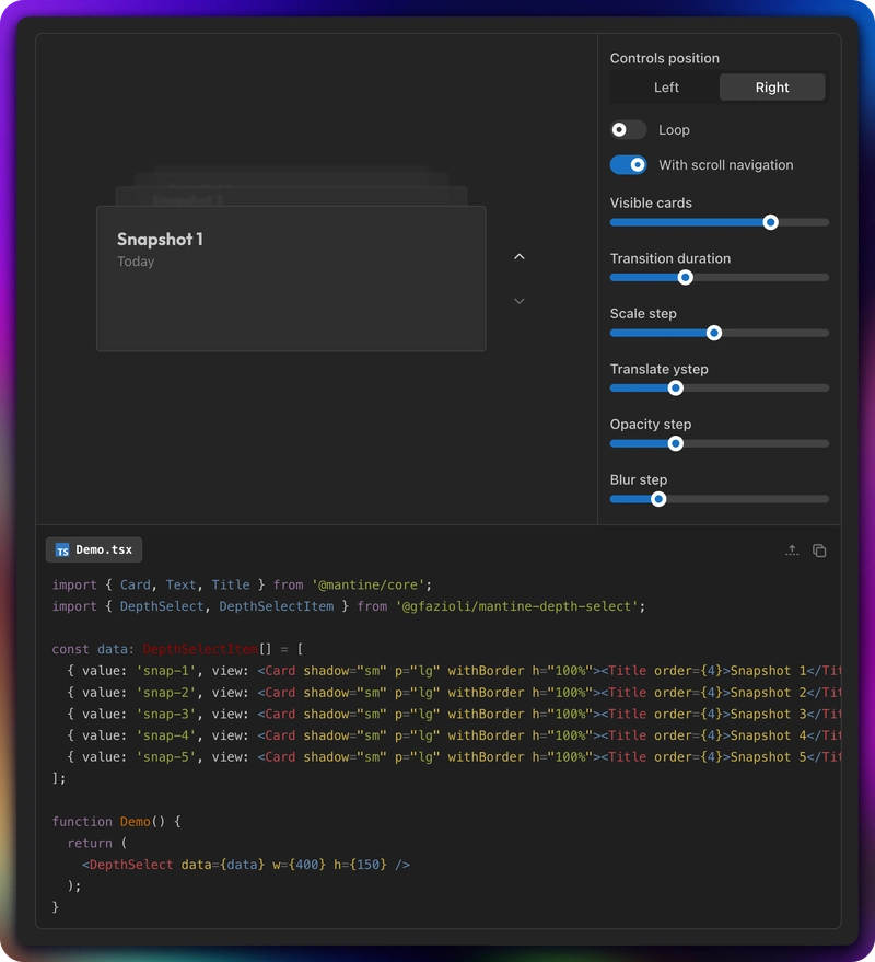 data—DepthSelectItem[]— Array of{ value, view }objects.valuecan bestringornumber,viewis anyReactNodevalue/defaultValue/onChange— Standard controlled/uncontrolled patternw/h— Dimensions of the card area (passed to the inner stack container)visibleCards— Number of cards visible in the stack (default:4)withControls— Show built-in arrow controls (default:true)controlsPosition—"right"(default) or"left"controlsProps— AllDepthSelectControlsPropspassed to the built-in controlsloop— Enable wrap-around navigation (default:false)withScrollNavigation— Enable mouse wheel / trackpad navigation (default:true)transitionDuration— Animation duration in ms (default:400)scaleStep/translateYStep/opacityStep/blurStep— Per-level depth effect parameters