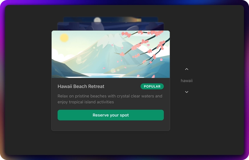 activeIndex - 1throughactiveIndex + visibleCards + 1are in the DOM. A dataset of 100 items renders ~6 nodesMemoized styles: Card CSS is computed once per navigation change via