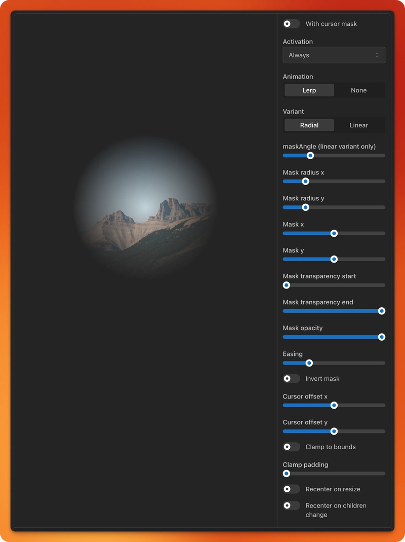 <Mask variant=”linear” invertMask withCursorMask maskAngle={90} maskRadius={180} maskFeather={30}>