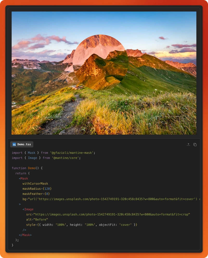 At its core, Mask is a simple wrapper: place it around your content, and decide whether the spotlight should be static or cursor‑tracked. The “inside” of the mask remains visible while the “outside” fades to transparent. Flip it with invertMask, and you get a “hole” effect to reveal backgrounds or layers beneath.